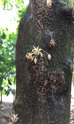 カカオの樹は幹生花といって、幹に花が咲き、実がなります。