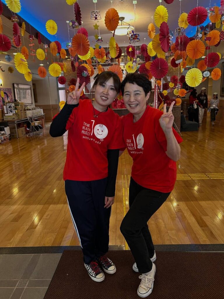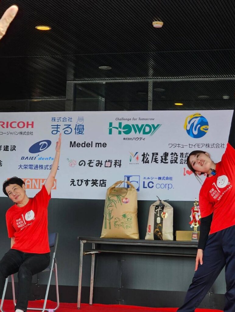 とってもチャーミングな笑顔の岡IRは介護職。ステージ上がる直前まで、一生懸命リードの練習をし、職員の皆様のあたたかい応援の中、会場が一体感に包まれました。代表のはーなも応援に駆けつけました。ご利用者をはじめ、地域の方々や岡さんの家族や友人が、空高く気持ちよい会場で、軽快な音楽にからだを動かし楽しまれました。地域に愛される施設でも人気の10分ランチフィットネスです。